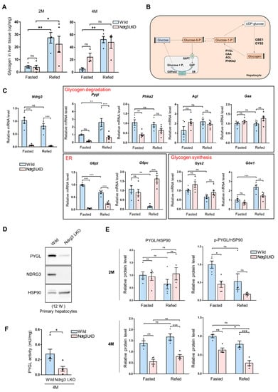 3.4. NDRG3 Abrogation in Liver Suppresses Glycogen Degradation Due to DownRegulation of PYGL and Glucose-6-Phosphate Transporter Member 4 (G6PT; SLC37A4) Expression