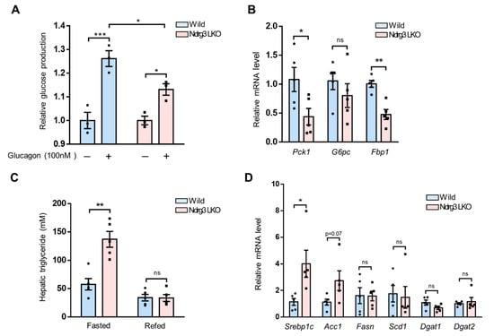 3.5. Liver-Specific Abrogation of NDRG3 Suppresses Hepatic Gluconeogenesis but Stimulates Liver Triglyceride Accumulation