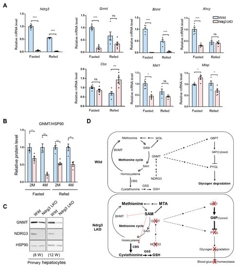 Sohn HA, Lee DC, Park A, Kang M, Yoon B-H, Lee C-H, Kim Y-H, Oh K-J, Kim CY, Park S-H, et al. Glycogen Storage Disease Phenotypes Accompanying the Perturbation of the Methionine Cycle in NDRG3-Deficient Mouse Livers. Cells. 2022; 11(9):1536. https://doi.org/10.3390/cells11091536