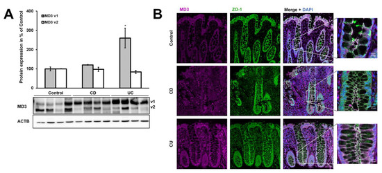 Expression and localization of MD3. (A) Representative Western blots and densitometric analysis of MD3 variants in biopsies from the sigmoid colon of control, CD, and UC patients. MD3 variant 1 (v1, upper band, ~46 kDa) was upregulated in UC, whereas variant 2 (v2, lower band, ~45 kDa) did not change (* p < 0.05; n = 8 for each group, normalized for β-actin). (B) Representative immunofluorescence images from colon tissue of control, CD, and UC patients to determine MD3 localization. Signal intensity was increased for better visibility and therefore could not be used for quantitative estimations. No changes in MD3 localization (magenta) were detected between controls, CD, and UC patients (counterstain ZO-1, green). Bars = 20 µm. Right images are insets of shown merge images, with higher magnification. Bar = 10 µm.