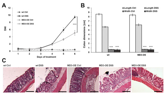 DSS MD3-OE mice developed less severe colitis (lower DAI) than DSS wildtype (wt) mice (Figure 4A), which was based on a lower occurrence of bloody and watery stools, but not in body weight loss. Colon length (Figure 4B) was reduced in both wt DSS and MD3-OE DSS compared to the respective controls, whereas there was no significant difference between colon length or width of wt and MD3-OE mice. In addition, the histological appearance of the colon was not notably different in any condition (Figure 4C). In wt as well as in MD3-OE, DSS treatment led to distorted crypt architecture, loss of the superficial epithelial lining, and immune cell infiltrations. However, in MD3-OE animals the extent of these changes appeared to be less eminent, which was in line with the appearance of their stool (Figure 4C, right MD3-OE DSS image).