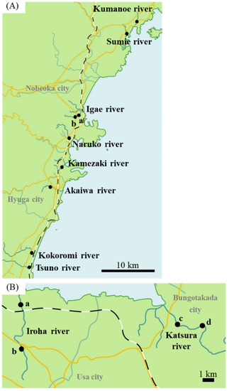 Sampling area. (A) Sampling area in Miyazaki River. In the Igae River, samples were collected from two locations (a, b). (B) Sampling area in Oita River. In Iroha and Katsura rivers, samples were collected from two locations (Iroha River: a, b. Katsura River: c, d.). Closed circles represent sampling areas. Scale bar: 10 km (A); 1 km (B).