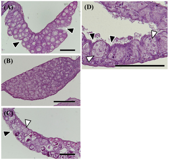 Hematoxylin-eosin (HE) staining of morphological sex-differentiated gonads in the wild Japanese eel Anguilla japonica. (A,C) Ovary. (B) Testis. (D) Differentiating ovary. Total lengths are (A) 342, (B) 306, (C) 257, (D) 297 mm. Arrowheads, notches in the epithelium of the ovary. White arrowheads, active germ cell growth. Scale bar, 100 µm.