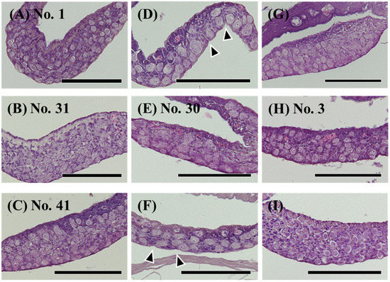 Hematoxylin-eosin (HE) staining of undifferentiated gonads in the wild Japanese eel Anguilla japonica. (A–C) Gonads of testis-like structures. (D–F) Gonads of ovary-like structures. (G–I) Undifferentiated gonads. Total lengths are (A) 250, (B) 305, (C) 313, (D) 281, (E) 299, (F) 310, (G) 251, (H) 257, (I) 318 mm. Arrowheads, notches in the epithelium of the ovary. Individual numbers (Nos.) correspond to those in Table 5 and Figures 10 and 11. Scale bar, 100 µm.