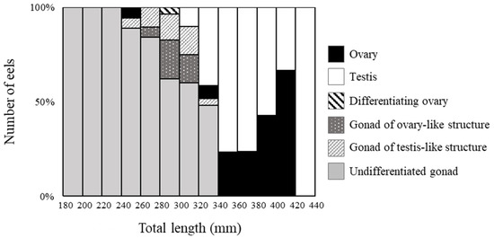 Percentage of morphological sex-differentiated eels with respect to body growth. Gonadal development was classified into six stages, and eels of each size were counted.