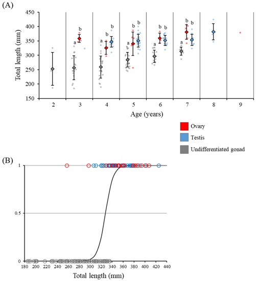 The TL of individuals with undifferentiated gonads, ovaries, and testes were plotted against age; even among eels of the same age, the TL of eels after morphological sex differentiation was significantly larger than that in the undifferentiated state (Figure 5A). In addition, comparing gonadal developmental stages and the TL using logistic regression, the TL corresponding to 10% morphological sex differentiation was 312.4 mm, and the TL for 90% was 343.5 mm (Figure 5B).