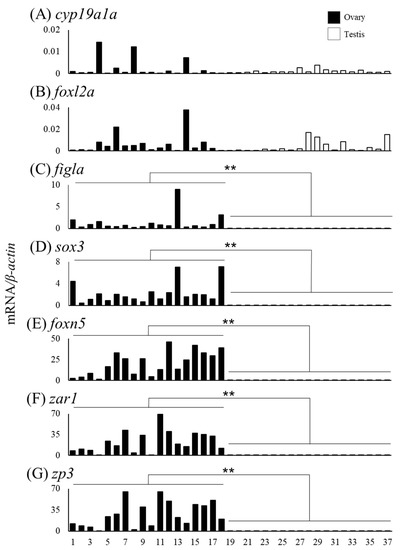 Messenger RNA levels of sex differentiation-related genes (cyp19a1a, foxl2a, figla, sox3, foxn5, zar1 and zp3) in the ovaries and testes of the wild Japanese eel Anguilla japonica. (A) cyp19a1a, (B) foxl2a, (C) figla, (D) sox3, (E) foxn5, (F) zar1 and (G) zp3 mRNA levels in the ovary and testis. Each column indicates mRNA levels normalized against β-actin expression. TL in the ovary and testis (Nos. 1–37); for details, refer to Table 3. ** P < 0.01.