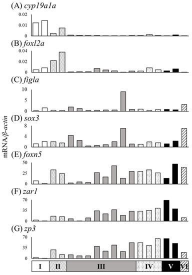 Relationships between stages of ovarian development and mRNA levels in gonads of the wild Japanese eel Anguilla japonica. (A) cyp19a1a, (B) foxl2a, (C) figla, (D) sox3, (E) foxn5, (F) zar1 and (G) zp3 mRNA levels in the ovaries of groups Ⅰ–Ⅵ. Each column indicates mRNA levels that are normalized against levels of β-actin. TL in eels of groups A–F; for details, refer to Table 4.
