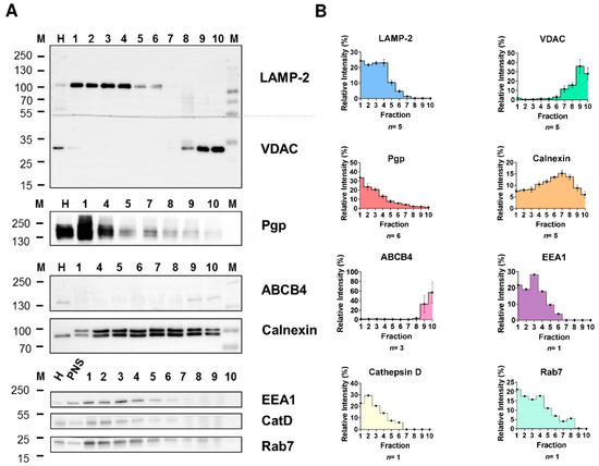 To improve gradient organelle separation, the subcellular fractionation protocol was optimized as shown in Figure S1C and Table S1. After centrifugation, the gradient was subdivided into 1 mL fractions denoted as F1–F10 (from top to bottom) and analyzed for organelle distribution by Western blotting. As shown in Figure 1, LAMP-2 and Pgp were enriched in gradient F1–F4 and clearly separated from mitochondrial contamination as visible by mitochondrial marker (VDAC) distribution to F6–F10 or F7–F10, depending on individual gradients. The presence of high levels of Pgp in the LAMP-2 enriched fractions (F1–4) detected by the C219 Pgp mAb was confirmed by another mAb that recognizes an extracellular epitope of Pgp (Figure S4).