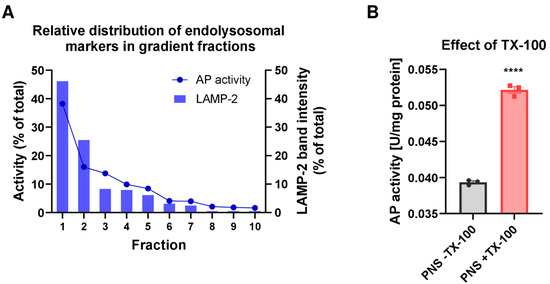 The activity of the luminal endolysosomal enzyme acid phosphatase in the gradient fractions in comparison to LAMP-2 distribution. (A) The activity of the luminal endolysosomal enzyme acid phosphatase (AP) was assessed in density gradient fractions to further define endolysosome-enriched fractions. AP activity in the gradient fractions was measured after endolysosomal membrane lysis with Triton X-100 (TX-100) and calculated in units (U) per mL. For each fraction, the percentage of total activity in all fractions combined (set to 100%) is plotted in comparison to the percentage of total recovered LAMP-2 in all fractions. The total LAMP-2 amount in each fraction was obtained by calculating the product of band intensity/µg total protein and total protein amount in the fraction. A peak for the relative AP activity as well as the endolysosomal marker protein LAMP-2 was detected in F1, indicating that the bulk of endolysosomes was contained in this fraction. Data were collected from one representative gradient. (B) Diagram showing the effect of TX-100 treatment on measured AP activity. The increase in AP activity after the addition of TX-100 to the post-nuclear supernatant (PNS) reflects the efficiency of organelle lysis and the structural integrity of organelles present in the PNS loaded onto the gradient. AP activity is presented in U/mg of protein. Data are shown as individual values and the median of three replicates. The significance of the difference is indicated by asterisks (**** p < 0.00001).