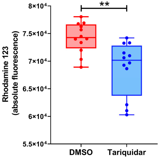 Uptake (or accumulation) of the Pgp substrate rhodamine 123 in the crude endolysosomal fraction of rat liver in the absence or presence of the Pgp inhibitor tariquidar. Tariquidar was used at a concentration of 0.5 µM and rhodamine 123 at 2 µM. Data are shown as boxplots with whiskers from minimum to maximal values; the horizontal line in the boxes represents the median value. In addition, individual data are shown. The experiment was performed 4-times with three replicates per experiment. The significance of the difference is indicated by asterisks (** p = 0.0018).