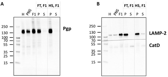 Detection of Pgp in the membrane fraction of F1. The endolysosome-enriched fraction was separated into soluble (luminal) and membrane subcompartments and analyzed by Western blotting for Pgp localization (A). The organelle membranes were ruptured applying two different methods in comparison, either repeated freeze–thaw (FT) cycles or a hypoosmotic shock (HS). The pellet (P) enriched in membrane proteins and the supernatant (S) containing soluble luminal proteins were analyzed by Western blotting (5 µg total protein/lane of P and corresponding amount of S). Liver homogenate (H), post-nuclear supernatant (PNS), and fraction 1 (F1) (5 µg total protein each) were analyzed for comparison. (B) LAMP-2 was used as a marker protein for the membrane fraction, whereas cathepsin D (CatD) served as a control protein for the soluble endolysosomal protein fraction.