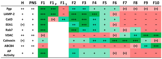 Overview of organelle marker distribution in the gradient fractions. Organelle marker and Pgp distribution in the gradient fractions (F1–10) according to high (+++), medium (++), low (+), or no (−) marker protein content in the respective fraction based on Western blot band intensities or acid phosphatase (AP) activity. Additionally, the Pgp protein level in the membrane enriched pellet (P) isolate and the luminal supernatant (S) resulting from endolysosomal subfractionation of gradient fraction (F) 1 are depicted. The organelle marker distribution is also highlighted by a color code from dark green (high marker content) to dark red (no marker localization). LAMP-2 (lysosomal associated membrane protein 2): endolysosomal marker; integral membrane protein, CatD (cathepsin D): endolysosomal luminal protease; EEA1 (early endosomal antigen 1): early endosomes; Rab7: late endosomal/endolysosomal marker; VDAC (voltage-dependent anion channel): mitochondrial marker; calnexin: ER marker; ABCB4: canalicular plasma membrane marker; AP: acid phosphatase (endolysosomal protease).