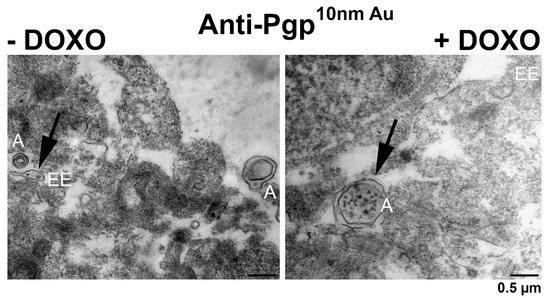 Ultrastructure of the localization of Pgp in immortalized hCMEC/D3-MDR1-EGFP cells, in which Pgp-EGFP expression was induced by 1 µg/mL doxycycline. In the left section, cells were sham-exposed, whereas in the right section, cells were exposed for 30 min to the Pgp substrate doxorubicin (DOXO; 10 µM) followed by pre-embedding immunogold labeling. In the sham-exposed cells with small autophagosomes (A), Pgp was predominantly recognized in the early endosomes (EE, arrow). Following doxorubicin exposure, Pgp was immunolocalized in large autophagosomes (A, arrow).