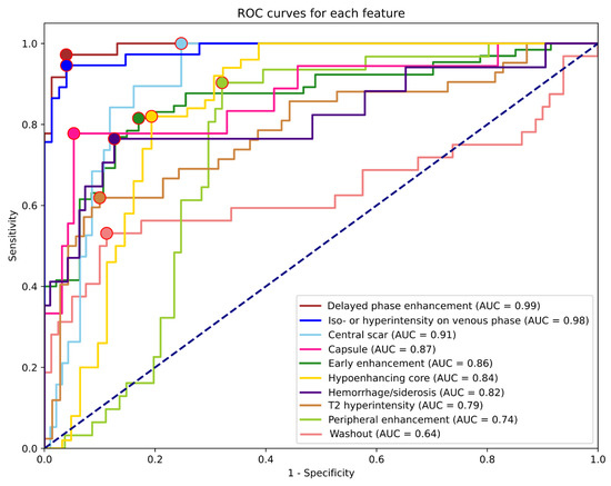 Table 3 summarizes the results for each feature, including all lesion types. The highest AUCs were reached for the detection of delayed phase enhancement (0.99) and iso- or hyperintensity on the venous phase (0.98). These features were only rarely detected as false positives or remained undetected. The least predictable features based on AUC were T2 hyperintensity (0.79), peripheral enhancement (0.74), and washout (0.64). ROC curves and corresponding AUC values are shown in