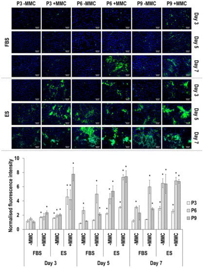 Qualitative brightfield microscopy analysis (Supplementary Figure S1) revealed that cells, in general, at day 3, when they were still at low density, adopted a triangular and/or elongated morphology, whilst at day 7, when they were at high density, exhibited a spindle-shaped morphology. Further, in FBS at day 7, the cells were able to cover the entire growth surface, whilst in ES at day 7, they appeared to lose their capacity to cover the entire growth surface as a function of passaging. MMC did not affect the cell morphology or the capacity of cells to cover the growth surface.