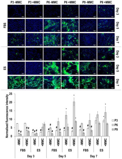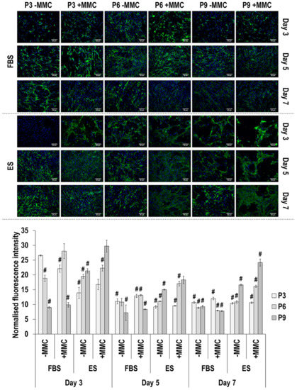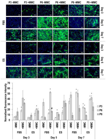 Immunofluorescence and image intensity analysis for fibronectin (Figure 7 and Supplementary Table S10) made apparent that, in general, MMC did not affect (p > 0.05) fibronectin deposition. With respect to passaging, in FBS without MMC, only at day 3, passaging resulted in a significant (p < 0.05) decrease in fibronectin deposition. In FBS with MMC, at day 3 and day 5, passage 9 induced the lowest (p < 0.05) fibronectin deposition and at day 7, passage 3 induced the highest (p < 0.05) fibronectin deposition. In ES without MMC, at day 3, passage 3 induced the lowest (p < 0.05) fibronectin deposition and at day 5 and day 7, passage 9 induced the highest (p < 0.05) fibronectin deposition. In ES with MMC, at day 3, day 5 and day 7, passage 3 induced the lowest (p < 0.05) fibronectin deposition and at day 3 and day 7, passage 9 induced the highest (p < 0.05) fibronectin deposition. With respect to time in culture, in FBS without and with MMC, passage 3 and passage 6 induced the highest (p < 0.05) fibronectin deposition at day 3 and, in passage 9 with MMC, fibronectin deposition was significantly (p < 0.05) decreased at day 7, in comparison to day 3 and day 5. In ES without and with MMC, all passages induced the highest (p < 0.05) fibronectin deposition at day 3.