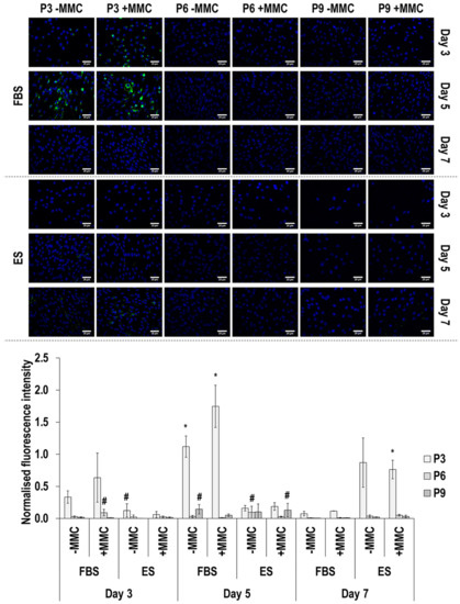 With respect to cell viability in ES, all groups had cell viability > 95%, whilst in FBS, all groups had > 95% cell viability apart from cells at day 5, without MMC and passage 3 (79%), passage 6 (94%) and passage 9 (84%) and with MMC and passage 3 (88%); and at day 7 without MMC and passage 3 (87%), passage 6 (86%) and passage 9 (84%) (Supplementary Figure S4 and Table S3).