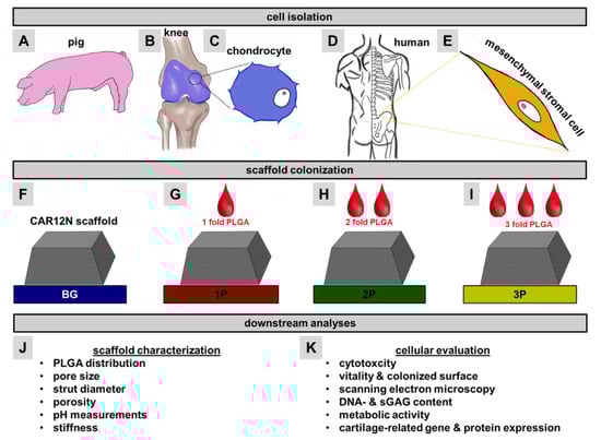 Graphical abstract. Knee joints from the pig (A,B) were explanted in order to isolate native chondrocytes (C). From the human iliac crest (D) mesenchymal stem cells (E) were obtained. Primary cells were subsequently colonized on pure bioactive glass scaffolds (BG, F), which were one-time (1P, G), twice (2P, H), or three times (3P, I) infiltrated with Poly(D-L-lactide-co-glycolide) (PLGA). Prior to colonization extensive analyses were performed to characterize the material properties (J). After up to 35 days in a dynamic culture, the cellular changes (cytotoxicity, viability, colonized surface, scanning electron microscopy, DNA and sulfated glycosaminoglycan (sGAG) contents, metabolic activity, immunocytochemical staining and real time polymerase chain reactions (PCR)) were examined in more detail (K).