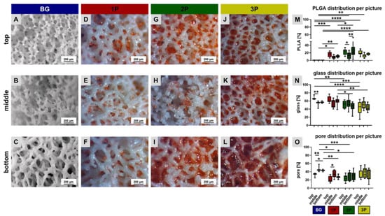 The leached scaffolds were vertically cut in half with a scalpel to evaluate the morphology in the top, middle and bottom regions of the scaffold. The red stained PLGA was detectable in every scaffold region but not homogenously distributed inside the scaffolds (1P, 2P, 3P). Due to using the “solvent phase infiltration” technique to introduce the PLGA into the scaffolds, a higher amount of PLGA accumulated in the top region (Figure 2). The evaluation of the percentage distribution of PLGA, glass and pores per picture gave an overview of their position within the scaffold and therefore, the scaffold characteristics. The PLGA amount was higher in the top and bottom regions of the 1P, 2P and 3P scaffolds in comparison to the middle region. The PLGA amount was significantly higher in the bottom region in the 2P scaffolds in comparison to the 1P bottom region and the middle region of the 2P scaffolds (Figure 2M). The average glass content was over 55%. Nevertheless, there was also a large scatter within the scaffold regions. In the top region of the 3P scaffold, there was significantly lesser glass content than in the top region of the 1P scaffold (Figure 2N). The pore fraction per scaffold region was also uniform within a variant. The pure BG scaffolds depicted the highest pore fraction (Figure 2O). It must be mentioned that these calculations refer only to light microscopic images of scaffold sections.