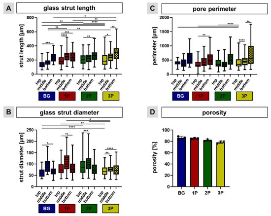 Based on the light microscopic images, the glass strut length, glass strut diameter and pore perimeter were measured. The glass strut lengths were generally greater than 150 µm. The glass struts were significantly longer in the bottom region compared to the top regions of all four scaffold variants. Additionally, there were significant differences between the BG and 3P, the 2P and the 3P scaffolds within the bottom regions. The strut length was in top region of the BG scaffolds significant smaller than in comparison to the 2P and 3P scaffolds (Figure 3A). In contrast to the glass strut length, the glass strut diameter in the middle region was the highest in every scaffold variant in comparison to the top and the bottom regions (significant differences in the BG and the 1P scaffolds). On average, the glass strut diameter was larger than 50 µm for all four scaffold variants. Significant differences of the strut diameter could be also calculated between the different variants in the top region, for example BG and 3P; 1P and 3P; BG and 2P (Figure 3B). In general, the pore perimeter in the top, middle, and bottom regions of all four scaffold variants was greater than 400 µm. In tendency, the pore perimeter in the bottom region of all four scaffold variants was larger than in the top and middle regions. The bottom region had a significantly higher perimeter in the 1P and the 3P scaffolds in comparison to the top or the middle regions. Indeed, the perimeter of the 3P scaffolds in the top region is significantly smaller than in the BG, the 1P and the 2P scaffolds (Figure 3C). Porosity slightly decreased with increasing PLGA infiltration (not significantly), with the pure BG scaffold having a porosity of over 86% (86.10 ± 2.98), while the 3P scaffold had a porosity of less than 80% (78.14 ± 2.02) (Figure 3D).