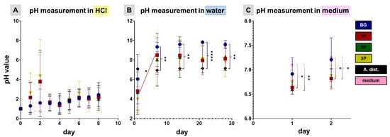 pH measurements in hydrochloric acid (HCl, A) in water (B) and in cell type specific culture medium (C). A total of 100 mg of pure bioactive glass scaffold (BG, blue) of single PLGA(1P, red), twofold (2P, green) and threefold PLGA infiltrations (3P, yellow) scaffolds was stored in 1 mL liquid (HCl, Aqua distilled (A. dist.), 10% FCS containing chondrocyte growth medium). The measurement in growth medium was undertaken only for 2 days, since it is normally changed every 2 days. All measurements were performed at RT (22.02 ± 0.11 °C). Significant differences (from four different scaffold batches) were calculated after two-way ANOVA with multiple comparison (*) for p < 0.05; (**) for p < 0.01 and (****) for p < 0.0001.