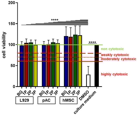 The cytotoxicity assay was performed to evaluate if the ion release negatively influenced the cell viability. In accordance with International Standards DIN EN ISO 10993-5 2009-10 norm not only murine L929 fibroblasts, but also the primary pACs and hMSCs (Figure 5) and K4IM (Supplemental Figure S2) were used since they were included in the following experiments. The normalized cell viability (negative control, which represents the fresh growth medium was set 100%) of all cell types (L929, pACs, hMSCs and K4IM) tested with four different scaffolds variants (BG, 1P, 2P, 3P) was over 95%. All tested substrates (growth medium after 48 h scaffold incubation) were highly significantly more cytocompatible compared to the positive control (DMSO, under 50%), which was highly cytotoxic. Therefore, none of the four scaffolds variants was cytotoxic and all could be used for further cell colonization experiments (Figure 5).