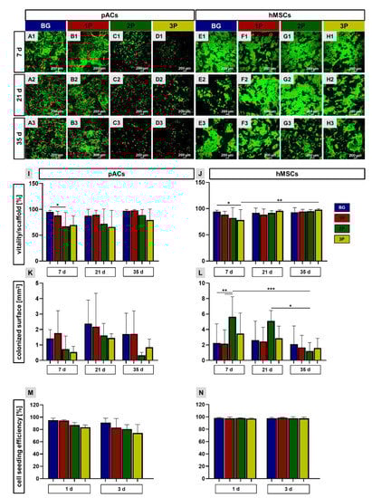 Viability assay of colonized scaffolds, calculation of the cell viability per scaffold surface, the colonized scaffold surface and the cell seeding efficiency. Representative pictures of three independent experiments show vital (green) and dead (red) porcine articular chondrocytes (pACs) (A1–D3) and human mesenchymal stem cells (hMSCs) (E1–H3) over a cultivation time of 7 to 35 days (d). pACs (I) and hMSCs (J) viability per scaffold surface was calculated after 7, 21 and 35 d. Results of the pACs (K) and hMSCs (L) colonized surface over the cultivation time. The cell seeding efficiency (%) was calculated for pACs (M) and hMSCs (N) after 1 and 3 d, with no significant differences. The pure bioactive glass (BG, blue), single (1P, red), twofold (2P, green) and threefold PLGA infiltrations (3P, yellow). Three independent experiments (n = 3) with cells from three different donors were performed. Two-way ANOVA combined with the post hoc Tukey´s multiple comparison test between the groups: p values: * p < 0.05, ** p < 0.01 and *** p < 0.005. Scale bar: 200 µm.