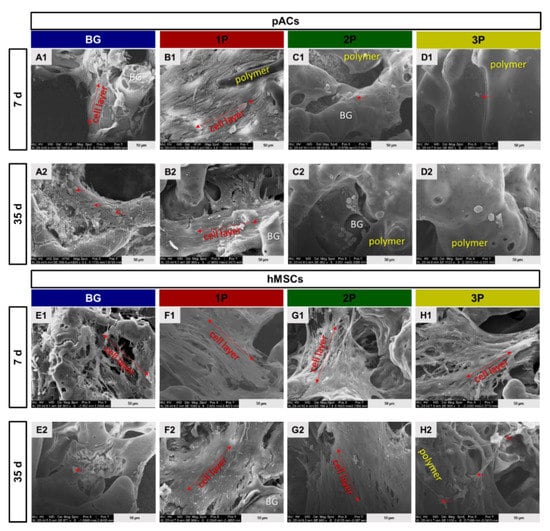 Scanning electron microscopy (SEM) of colonized scaffolds. Representative images of the morphology not only of the pACs (A1–D2) on the scaffolds after 7 days (d) (A1–D1) and after 35 d (A2–D2) but also of hMSCs (E1–H1) on the scaffolds after 7 (E1–H1) and 35 d (E2–H2) in dynamic culture. The pure bioactive glass (BG, blue), single (1P, red), twofold (2P, green) and threefold PLGA infiltrations (3P, yellow). Scale bar: 50 µm. pACs = porcine articular chondrocytes, hMSCs = human mesenchymal stem cells, BG = bioactive glass. Single cells are marked with red arrow and cell layers are marked by double headed arrows.