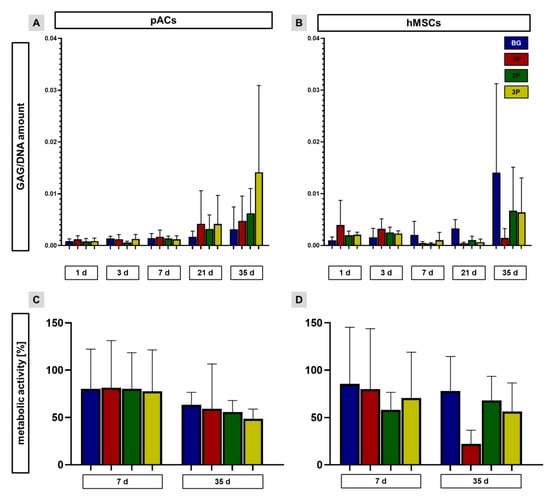 The GAG per DNA amount was determined after 1, 3, 7, 21 and 35 days. The GAG per DNA amount was slightly increasing over time in pAC-colonized scaffolds. At 21 and the 35 days, high standard deviations could be recognized. After 21 and 35 days the polymer-infiltrated scaffolds had a higher GAG per DNA amount than the pAC-colonized scaffolds (Figure 8A). The GAG per DNA amount was also continuously increasing in the hMSC-colonized BG scaffolds, while in the 1P scaffolds the highest GAG per DNA amount could be already recognized after 1 day and was then slightly decreasing. In the 2P and 3P hMSC-colonized scaffolds more variations were seen (Figure 8B). The metabolic activity was evaluated after 7 and 35 days and was related to the uncolonized scaffolds. The pAC-colonized scaffolds showed no significant differences after 7 days. In all four scaffold types only a slight trend of reduced metabolic activity could be seen (Figure 8C). The metabolic activity of hMSC-colonized scaffolds was highest on the BG scaffolds after 7 days (74%). A not significant reduction in metabolic activity could be determined not only on the BG scaffolds but also on the 1P and 3P scaffolds after 35 days. A slight increase in the metabolic activity could be calculated in the 2P scaffold after 35 days compared to 7 days (Figure 8D).