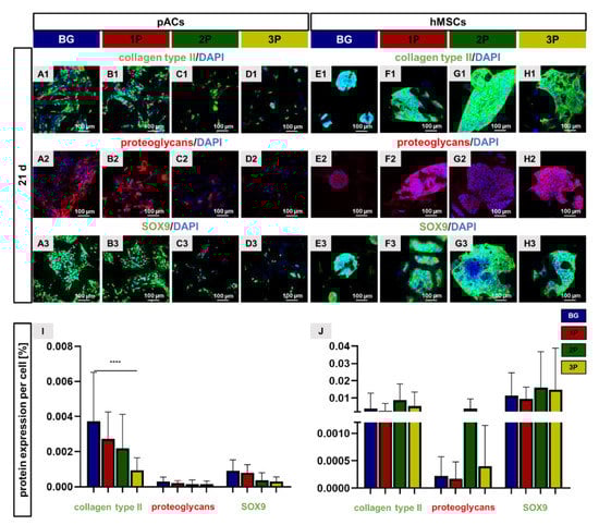 Cartilage-specific protein expression after 21 days of scaffold colonization. Representative immunocytochemical staining of collagen type II (green) and cell nuclei (blue) of pACs (A1–D1) and hMSCs (E1–H1), of cartilage proteoglycans (red) and cell nuclei (blue) of pACs (A2–D2) and hMSCs (E2–H2) and the transcription factor SOX9 (green) and the cell nuclei (blue) of pACs (A3–D3) and hMSCs (E3–H3). The calculation of the immunoreactivity (collagen type II, proteoglycans and SOX9) per cell was performed for pACs (I) and hMSCs (J). The pure bioactive glass (BG, blue), single (1P, red), twofold (2P, green) and threefold PLGA infiltrations (3P, yellow). Scale bar: 100 µm. n = 3. One-way ANOVA (post hoc Tukey Test) for comparison between the groups. p values: **** p < 0.0001. pACs = porcine articular chondrocytes and hMSCs = human mesenchymal stem cells.