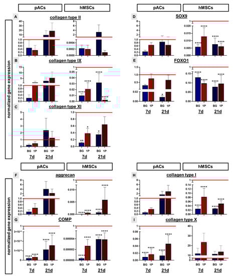 Normalized gene expression of cartilage extracellular matrix components and the transcription factors SOX9 and FOXO1 after 7 (full bars) and 21 (checkered bars) days (d) in the BG scaffolds (blue) and the PLGA-infiltrated BG scaffolds (red). Relative gene expression of collagen types II (A), IX (B), XI (C), SOX9 (D), FOXO1 (E), aggrecan (F), COMP (G), collagen types I (H) and X (I) were related to the native porcine cartilage (red line = 1). The pure bioactive glass (BG, blue) and single (1P, red) PLGA infiltration. Three independent experiments with cells of three different donors are summarized and show mean with standard deviation. Significant differences were calculated after one-way ANOVA (post hoc Tukey Test): p values * p < 0.05, ** p < 0.01, **** p < 0.0001. Gene expression was normalized to the reference gene β-actin (ACTB). pACs: porcine articular chondrocytes, hMSCs: human mesenchymal stem cells.