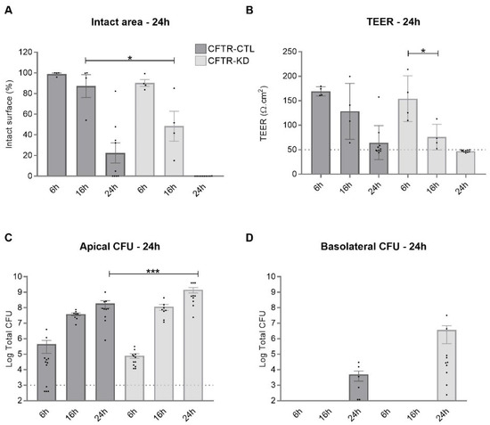 Polarized CFTR-CTL and CFTR-KD Calu-3 cultures were infected as previously described [36]. Briefly, bacteria were grown overnight, washed, and resuspended in physiological saline at a density of 105 CFU/mL. Ten µL of this suspension was then added apically to the CFTR-CTL and CFTR-KD cultures on Transwell filters (final inoculum of 103 CFU per well, MOI of 0.003). Next, 10 µL of saline was added to the uninfected control cells. Cells were incubated for 6 h, 16 h, and 24 h at 37 °C.