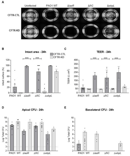 Vulnerability of the CFTR-KD epithelium to PAO1 strains with attenuated virulence at 24 h post-infection. CFTR-CTL (dark gray) and CFTR KD (light gray) epithelia were apically infected with 103 CFU of the wild type PAO1 strain or PAO1 mutants (ΔlasR, ΔfliC, ΔwbpL) for 24 h. The intact epithelial surface (A,B), TEER values (C), apical (D), and basolateral (E) CFUs were determined in uninfected and infected conditions. (A) Representative images of lesions induced by each bacterial strain in the CFTR-CTL and CFTR-KD epithelia. (B) The intact epithelial surface was expressed as % of the initial area measured in uninfected conditions (PAO1 WT: N ≥ 9, n = 1; ΔlasR: N = 4, n = 1; ΔfliC: N = 10, n = 1; ΔwbpL: N = 4, n = 1). (C) TEER values, which were measured in duplicate for each insert, were expressed as Ω.cm2. The dotted line indicates the average TEER values of empty Transwell filters (PAO1 WT: N ≥ 9, n = 2; ΔlasR: N = 4, n = 2; ΔfliC: N = 10, n = 2; ΔwbpL: N = 4, n = 2). (D) The dotted line represents the initial amount of inoculated bacteria. *** indicates the degree of significance, two-way ANOVA tests (PAO1 WT: N ≥ 9, n ≥ 2; ΔlasR: N = 4, n ≥ 2; ΔfliC: N = 10, n ≥ 2; ΔwbpL: N = 4, n ≥ 2). (E) (PAO1 WT: N ≥ 9, n ≥ 2; ΔlasR: N = 4, n ≥ 2; ΔfliC: N = 10, n ≥ 2; ΔwbpL: N = 4, n ≥ 2). Points with a value of zero do not appear in logarithmic scale.