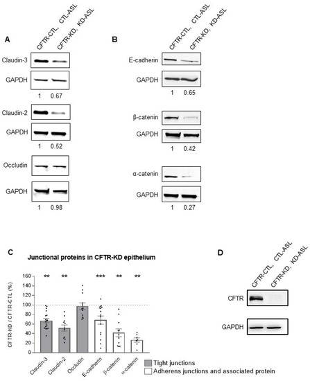 Proteins were extracted from the polarized CFTR-CTL and CFTR-KD Calu-3 cells using the Nonidet-P40 lysis buffer (150 mM NaCl, 50 mM Tris (pH 8.0), 1% NP-40 (AppliChem A1694, Milano, Italy)) and Roche complete™ Protease Inhibitor Cocktail (Cat. No. 04693124001, Sigma, St. Louis, MO, USA). The cell lysates were centrifuged at 10,000 g for 15 min at 4 °C and the protein concentration was quantified with a Pierce BCA Protein Assay Kit (ThermoFisher, Cat. No. 23228, Rockford, IL, USA). Amounts of 5–10 µg of the proteins were separated in denaturing SDS-PAGE gels (Bio-Rad 161-0301, Marnes-la-coquette, France), transferred onto a Porablot NCP nitrocellulose membrane (Macherey-Nagel, Cat. No. 741280, Hoerdt, France), and blocked for 1 h at room temperature (RT) using 3% BSA (Sigma-Aldrich A7906, St. Louis, MO, USA) in PBS–Tween (PanReac Applichem A4974, Barcelona, Spain) buffer. Primary antibodies (listed in Table S1) were incubated with the membranes overnight at 4 °C with agitation. GAPDH (Merck, Darmstadt, Germany) or β-actin (Sigma, St. Louis, MO, USA) antibodies were used as the loading control. After primary antibody fixation (E-cadherin and β-catenin: Cell Signaling, Danvers, MA, USA; Claudin-3, claudin-2 and α-catenin: Abcam, Waltham, MA, USA; Occludin and ZO-1: Invitrogen, Rockford, IL, USA), the membranes were washed with PBS–Tween buffer, followed by horseradish peroxidase-coupled secondary antibody incubation. Proteins were finally detected using the chemiluminescent HRP substrate Immobilon™ Western (Millipore, Cat. No. WBKLS0500, Darmstadt, Germany) and quantified with ImageJ.