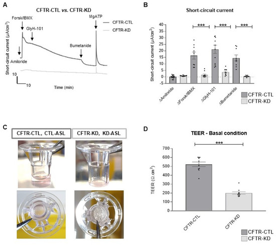 Defective CFTR-dependent ion transport, ASL volume, and transepithelial resistance of the CFTR-KD epithelium. (A) The CFTR-CTL and CFTR-KD Transwell inserts were bathed between an apical and a basal solution creating a Cl- gradient, continuously gassed with 95% O2 and 5% CO2 at 37 °C. The potential difference was clamped to monitor the short-circuit current value (Isc, µA/cm2) during the addition of amiloride (apical 100 µM); forskolin/IBMX (apical and basal 10/100 µM); GlyH-101 (apical 20 µM); bumetanide (basal 100 µM); MgATP (basal 100 µM); and DMSO as the control of the GlyH-101 effect. Representative traces of the CFTR-CTL (dark gray) and CFTR-KD (light gray) Isc currents are shown. (B) Mean ± SEM ΔIsc currents evoked by the different drugs in the CFTR-CTL and CFTR-KD (N ≥ 5, n = 2) inserts. *** indicates the degree of significance, two-way ANOVA tests. (C) Representative images of the CFTR-CTL and CFTR-KD epithelia polarized for at least 15 days on Transwell filters at ALI showing the low ASL volume and dehydrated surface of the CFTR-KD cultures. (D) TEER values (Ω.cm2) of the CFTR-CTL (dark gray) and CFTR-KD (light gray) cells polarized for at least 15 days on Transwell filters at ALI (N = 10, n ≥ 2). *** indicates the degree of significance, paired Student tests.