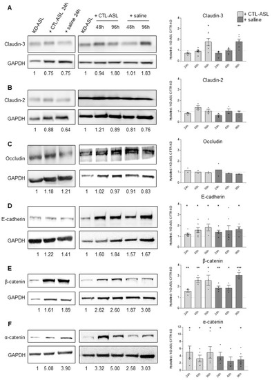 Expression of junctional proteins in the apically rehydrated CFTR-KD epithelium. The amount of junction protein expression was estimated by Western blot and quantified in the CFTR-KD epithelia before and 24 h (left panels), 48, and 96 h (right panels) after apical rehydration with CTL-ASL or physiological saline. Representative Western blot for claudin-3 (N ≥ 4, n = 1) (A), claudin-2 (N ≥ 3, n = 1) (B), occludin (N = 2, n = 1) (C), E-cadherin (N ≥ 4, n = 1) (D), β-catenin (N ≥ 3, n = 1) (E), and α-catenin (N ≥ 4, n = 1) (F). The relative expression level is indicated below each lane. *, **, *** indicate the degree of significance, paired Student tests. Note the different scale for the α-catenin protein expression.