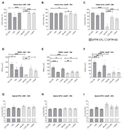 Protection of the CFTR-KD epithelium to PAO1 strains with attenuated virulence by rehydration. CFTR-CTL (dark gray) and CFTR-KD (light gray) epithelia were apically infected with 103 CFU of ΔfliC (A,D,G) or ΔlasR for 16 h (B,E,H) or 24 h (C,F,I). The intact epithelial surface (A–C), TEER values (D–F), and apical (G–I) CFUs were determined in response to ASL manipulation. (A–C) The intact epithelial surface was expressed as % of the initial area measured in uninfected conditions (ΔfliC: N = 3, n = 1; ΔlasR 16 h: N = 4, n = 1; ΔlasR 24 h: N = 6, n = 1). (D–F) TEER values (Ω.cm2) were measured in duplicate for each insert. The dotted line indicates the average TEER values of empty Transwell filters (ΔfliC: N = 3, n = 2; ΔlasR 16 h: N = 4, n = 2; ΔlasR 24 h: N = 6, n = 2). (G–I) The dotted line represents the initial amount of inoculated bacteria (ΔfliC: N = 3, n = 2; ΔlasR 16 h: N = 4, n = 2; ΔlasR 24 h: N = 6, n = 2). *, **, *** indicate the degree of significance, two-way ANOVA tests.