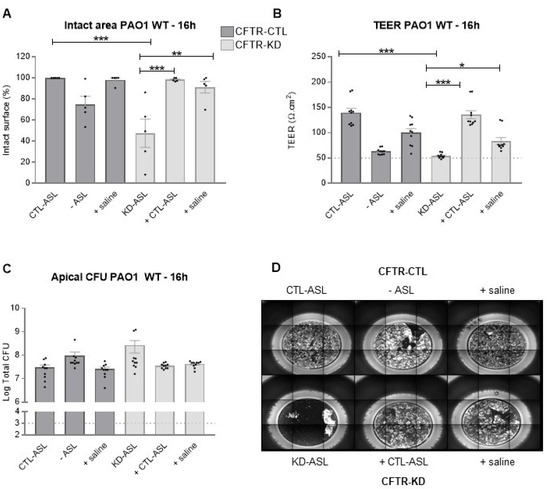 Finally, we evaluated whether apical hydration could offer protection against the WT PAO1 strain 16 h post-infection. We observed that both CTL-ASL and saline were able to protect the CFTR-KD epithelium from bacterial-induced lesions (Figure 8A,D). This protection was associated with an increased TEER (Figure 8B), while apical bacterial growth remained (Figure 8C).