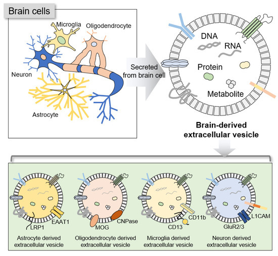 Brain-derived extracellular vesicles. Various cell types are found in the brain, including neurons, oligodendrocytes, astrocytes, and microglia, and these cells secrete extracellular vesicles (EVs) that reflect the characteristics of their origin cells. These EVs carry various cargoes such as DNA, RNA, proteins, and metabolites. Given that EVs share the characteristics of their origin cell, it is possible to sort cell type-specific EVs using the surface markers of each cell type in the brain.