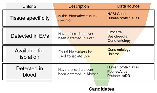 Regardless of brain-specific expression, a gene cannot be used in a BDEV-based strategy if it is not loaded into an EV. Therefore, it is necessary to select a biomarker that has been detected in EVs or is likely to exist in EVs. As the demand for information on EVs has increased, databases such as ExoCarta and Vesiclepedia have begun to provide data on EV cargoes [32,33]. In addition to providing gene annotation information, the Gene Ontology (GO) resource provides information on the location of a gene product in the cell [34]; thus, annotation information on the gene products that exist in EVs is available. As research on EVs has progressed, our understanding of whether proteins are loaded into EVs has also improved. Two EV cargo loading mechanisms exist: (1) proteins are loaded into EVs via the endosomal system (exosome) and secreted and (2) proteins are loaded together by membrane shedding (microparticles) [4]. Based on these basic biological processes, we can infer whether endosomal system proteins or membrane proteins are likely to be loaded into EVs. Some studies have shown that certain protein motifs facilitate EV loading [35]. Improving our understanding of the motifs that promote EV loading will improve our ability to predict the biomarkers likely to be loaded into EVs. If databases and the available information are used effectively, it will become possible to select a specific protein biomarker known to be EV cargo or tentatively identify cargo candidates with a high probability of success.