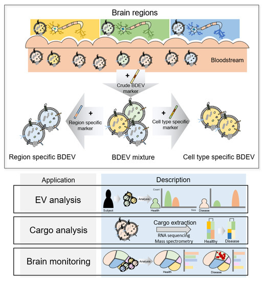The human brain has brain regions with specialized functions and different cell subtype compositions; thus, the molecular and biological characteristics of brain diseases that occur in each brain region are also different, and the treatment for these diseases differs accordingly. Therefore, discovering brain region-specific markers in the brain is important for diagnosing different brain diseases (Figure 3). It is difficult to accurately diagnose a specific brain disease in its early stage because the early pathological characteristics of brain diseases are often similar and mixed [38,39]. Hence, using BDEVs for brain region- or cell type-specific diagnosis at the molecular level could make it possible to identify brain diseases more accurately at an earlier stage. The development of analysis technology and the accumulation of data have led to the identification of brain region- and cell type-specific expression biomarkers. The Human Protein Atlas provides RNA expression information for each brain region in humans, and the Allen Brain Atlas also provides this information or in situ hybridization results. In particular, single cell analysis has led to the discovery of brain cell type-specific biomarkers [40,41]. Establishing a biomarker capable of isolating bulk BDEVs secreted from the entire brain will facilitate a fuller analysis by enabling the double-capture of additional region- or cell type-specific biomarkers, even if these biomarkers are not brain-specific. For example, EV secretion is known to be increased in cancer cells [42]; if EV secretion changes according to the disease state, such as in cancer, assessing the subpopulation of each BDEV biomarker will help accurately diagnose the disease [43]. Alternatively, new diagnosis systems could be constructed using molecular monitoring of brain-derived region- or cell type-specific EVs.