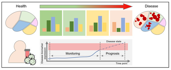 By analyzing blood-based BDEVs, we can indirectly identify the state of the brain using a minimally invasive method that is less burdensome than repeated biopsies. Moreover, using this method, it will be possible to build a BDEV-based sustainable brain monitoring system (Figure 4). Such a system could capture the prognosis of a disease through the periodic collection of the patient’s blood, isolation of BDEVs, and continuous monitoring of disease-related molecules. The measured molecule may be a well-known biomarker (e.g., amyloid beta, amyloid precursor protein, tau, synuclein, and neuron-specific enolase) or a new biomarker discovered using the above-described BDEV-based brain disease diagnosis strategy. Furthermore, if information from various research fields is accumulated, it may be possible to build an AI-based automated diagnosis system through machine learning.