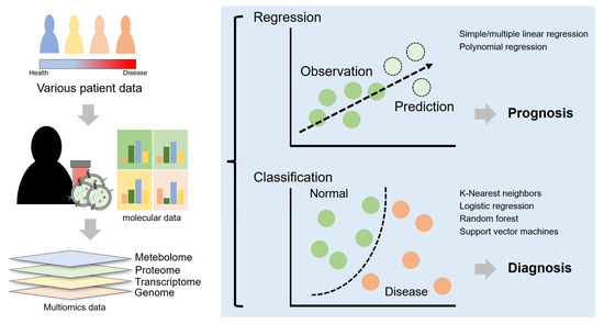 The development of high-throughput data production methods, e.g., sequencing and mass spectrometry, has facilitated the collection of molecular data from individual patients. By combining this data with machine learning, AI-based diagnosis is becoming possible. The biological activities of humans are controlled by complex interactions at various levels such as the transcriptome, proteome, and metabolome. In addition, a symbiotic microbiome within humans is being actively studied in an attempt to explain cellular activities more accurately (Figure 5). Rather than attempting to understand biological activities in only one major field, which was once the standard, the era of multiomics has enabled researchers to study biological activities in several different biological layers [44]. Given the complexity of these interactions, machine learning, a field of AI in which data are interpreted via computational methods and universal patterns are derived from the data, is now being applied to help interpret multiomics data, which is difficult to interpret using traditional human-led methods. Moreover, studies have been conducted to apply the results of machine learning to disease diagnosis.