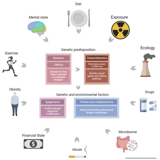 Over the past few decades, large-scale studies have focused on the molecular mechanisms underlying the procedures of understanding multifactor complex phenotypes. Combining genomics with proteomics or metabolomics can speed up the process by providing a complementary chain of evidence to connect genotypes (variants) to phenotypes (outcomes). Nevertheless, the genetic variants identified to date only explain a small part of certain phenotypes, and additional non-genetic factors, such as diet, lifestyle, and other environmental factors, likely in conjunction with susceptibility genes, commonly influence the pathogenesis of diseases. The integration of genomics, transcriptomics, and epigenomics can combine genetic predisposition and RNA regulation with environmental factors to comprehensively and intensively describe diseases, as illustrated in Figure 1.