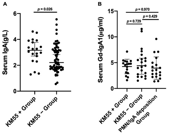 Compared to the KM55− subgroup, the level of serum IgA with KM55+ patients was higher (3.2 versus 2.2 g/L, p = 0.026). There was no significant difference in level of serum Gd-IgA1 in KM55+ subgroup, KM55− subgroup, and PMN/IgA deposition group separately (Figure 4).