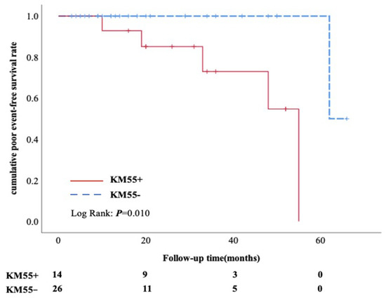 Kaplan-Meier analysis. Cumulative poor event-free renal survival rate between the KM55+ and KM55− subgroups.