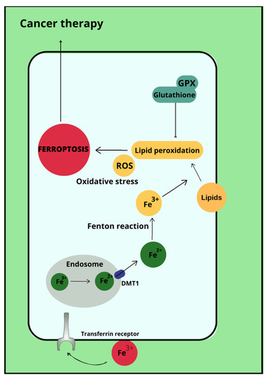 Carcinogenesis is promoted by the formation of reactive oxygen species, which can lead to DNA and protein damage. This results in mutation of proto-oncogenes and tumor suppressor genes [48]. The effect of iron on tumorigenesis is well documented on animal cells, although there are no clear conclusions in all studies. Iron as an agent of carcinogenesis has been particularly studied on lung, kidney and peritoneal cells [49]. Some studies confirm that excess iron makes tumors grow faster [50]. Furthermore, it is possible that reduced iron concentrations in premenopausal women and blood donors, as well as hepatitis C patients who underwent phlebotomies, are associated with a lower risk of tumorigenesis [51]. Animal cell studies suggest that iron deficiency may also contribute to a higher incidence of neoplastic proliferation compared to groups with normal iron levels [52]. However, observations of lung adenocarcinoma proliferation in mice show that iron loading does not affect tumor development and that tumor size is also not dependent on iron concentration [53]. An explanation for the abnormal iron metabolism in tumour cells can be explained by the example of renal cell transformation, in which ferritin is downregulated by transforming protein p21 (H-Ras). This leads to increased levels of labile iron ions, and these lead to tumour cell proliferation [54].