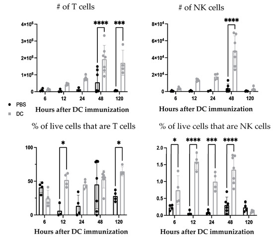 The cellularity of the local draining lymph node changed following dendritic cell (DC)-based vaccination.Ex vivo-generated DC-based vaccines were administered into the hind footpads of female C57Bl/6 mice (n = 2–7 per treatment), and then the popliteal lymph nodes were examined six-, 12-, 24-, 48-, and 120 h post-immunization to evaluate changes in cellularity. The number and percentage of natural killer (NK) and T cells in the lymph nodes were quantified at each time point following DC immunization using flow cytometry and compared with lymph nodes from control mice that received injections of phosphate-buffered saline (PBS). Statistical analysis was performed using a two-way analysis of variance; p-value < 0.05 (*), p-value < 0.001 (***), p-value < 0.0001 (****). Graphs show the means and the standard deviation with each dot representing an individual mouse.