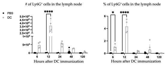 Rapid recruitment of a Ly6G+ population to the local draining lymph node following dendritic cell (DC) vaccination.Ex vivo-generated DC vaccines were injected into the hind footpads of female C57BL/6 mice (n = 2–6 per treatment), and the local draining lymph node was examined for Ly6G+ cells. Ly6G+ cells were assessed by flow cytometry six, 12, 24, 48, and 120 h post-DC immunization. The number and percentage of Ly6G+ cells in the lymph node of DC-immunized mice were compared with phosphate-buffered saline (PBS)-injected control mice. Significance was determined statistically using a two-way analysis of variance.; p-value < 0.05 (*), p-value < 0.0001 (****). Graphs show the mean and the standard deviation with each dot representing an individual mouse.